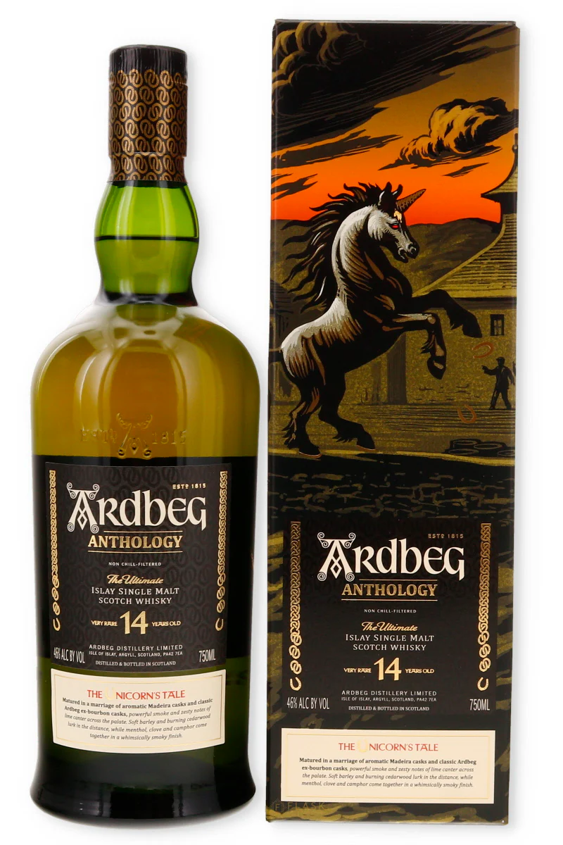 The Ardbeg 14 Year Old Anthology, also known as “The Unicorn’s Tale,” is a limited-edition single malt matured in a combination of ex-Madeira and ex-bourbon casks. This unique cask combination results in a complex whisky that balances Ardbeg’s signature peat smoke with rich fruit and sweet, woody notes.