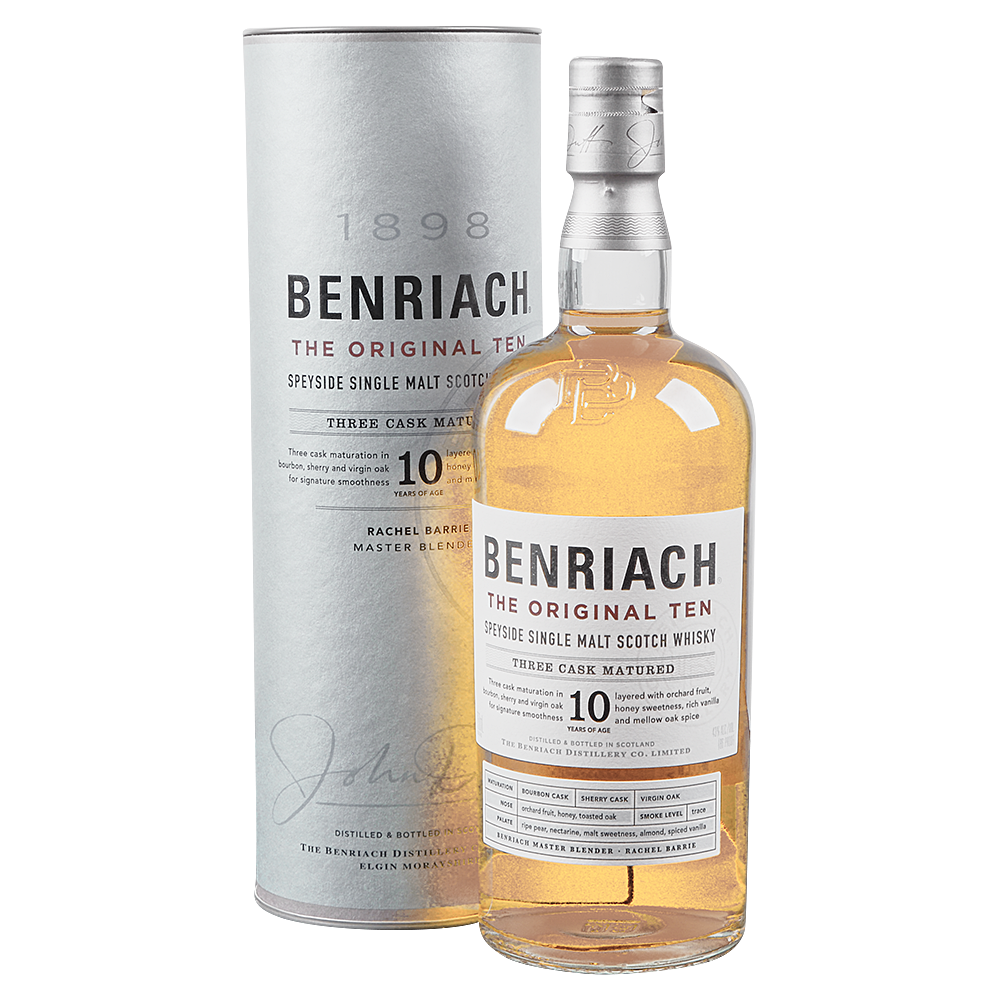 Benriach 10yr “The Original Ten” tasting notes highlight a fruit-forward Speyside character with notes of honeyed malt, orchard fruits (like green apple and pear), and creamy vanilla, supported by a delicate wisp of toasted oak. The palate features these flavors, plus soft spices and hints of citrus zest, leading to a long, crisp finish with lingering barley richness.