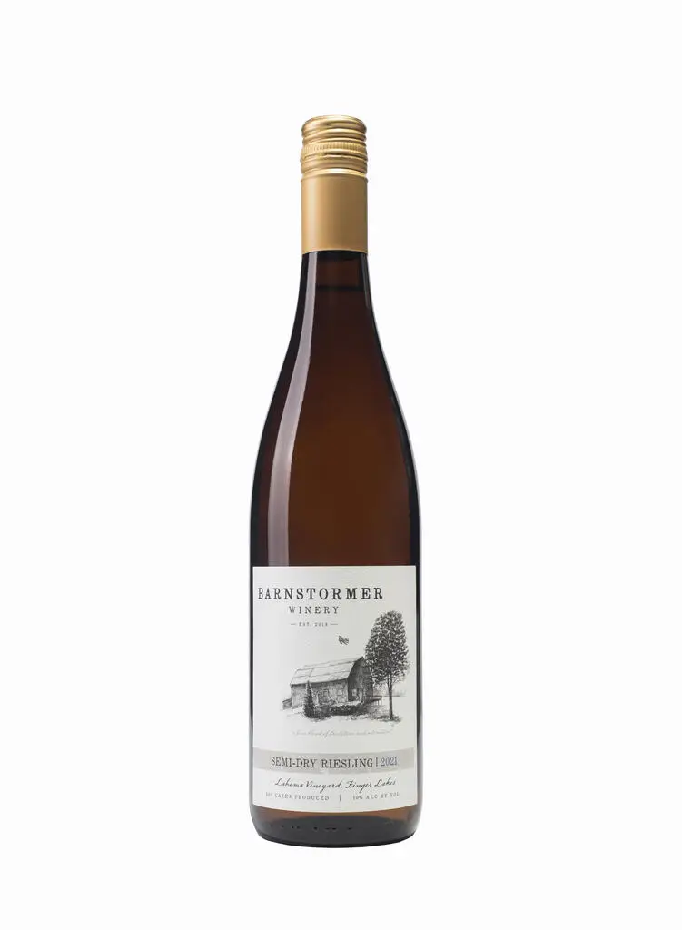 BarnStormer Winery’s Semi-Dry Riesling typically features complex layers of melon, apricot, and lemon with mineral and brioche notes, balanced by bright, crisp acidity. The wine offers a “waxy” body and is known for its fruit-forward character with a hint of sweetness that complements the acidity.